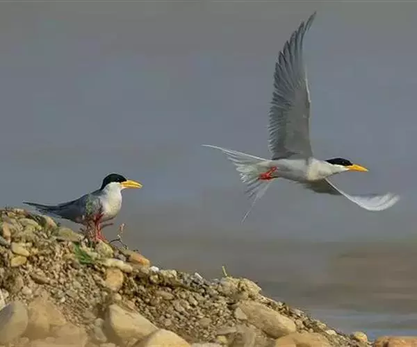 黄嘴河燕鸥为留鸟,常单独或成2-3只的小群活动,频繁地在江河的上空飞翔,很少停息。飞行轻快而敏捷,缓慢而悠闲,往来于青山绿水之间,发现食物后则急速落入水中,取食后再升入空中。