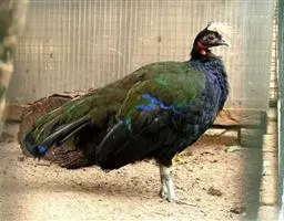 雄性装饰着精美的色彩,通体底色黑色,泛深绿的青铜色光泽,背后有一些较深的羽毛,胸部和尾巴的羽毛紫蓝色;颈部裸露出鲜红色的皮肤,这些充满活力的雄鸟还拥有一个明亮的长长而浓密的白色鬃毛羽冠,没有蓝孔雀和绿孔雀那样漂亮修长的尾羽;但在尾巴打开展示时,有一个令人印象深刻的扇面。