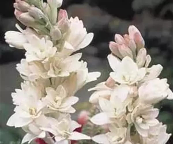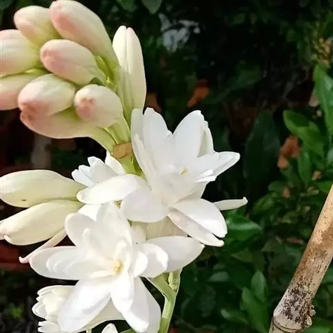 晚香玉(学名:Polianthes tuberosa L.)是石蒜科,晚香玉属多年生草本植物,高可达1米。茎直立,不分枝。基生叶片簇生,线形,顶端尖,深绿色,在花茎上的叶散生,向上渐小呈苞片状。穗状花序顶生,每苞片内常花,苞片绿色;花乳白色,浓香,花被裂片彼此近似,长圆状披针形,子房下位,花柱细长,蒴果卵球形,种子多数,稍扁。7-9月开花。