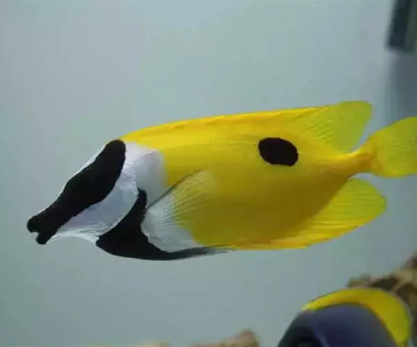 狐面鱼,学名:Siganus vulpinus (Schlegel and Müller, 1845),又名狐狸鱼,分布于菲律宾、中国台湾、太平洋的珊瑚礁海域,属臭肚鱼科。体长15-20cm,椭圆形。头部三角形,嘴尖前突。眼睛靠近头顶。体色金黄,背部中央有一棕色圆斑,头部银白色,两眼间有一条棕色环带,胸部和胸鳍基部棕色,脸面花纹图案酷似狐狸头面而的名。饲养水温27-28摄氏度,海水[url]比重1.022-1.023,海水ph值8.0-8.5,饵料有冰冻鱼虾肉、水蚯蚓、藻类、切碎烫熟的菜叶、海水鱼颗粒饲料等。