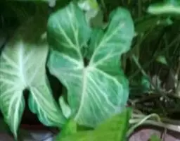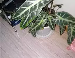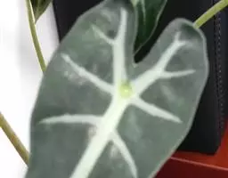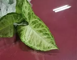 幼株叶柄苍绿色,具淡紫色斑块,长为叶片的1/3-1/4,至中部以上具鞘;叶片表面中肋白色,余为亮如丝绢的绿色;成熟植株叶柄长约为叶片的1/2,下半部具鞘;叶片宽椭圆形,短渐尖,长25-35厘米,宽10-19厘米;花枝上部的叶柄短,至中部具鞘,叶片卵形,基部近心形;I级侧脉18-20对,与中肋成70度角,斜伸,近边缘上升。