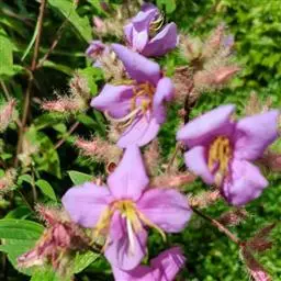 稀疏的聚伞花序组成圆锥花序,顶生,长7-22厘米或更长;花萼长约2.3厘米,外面除被多轮的刺毛状有柄星状毛外,尚密被微柔毛,裂片4,长三角形或卵状三角形,长约1.1厘米;花瓣深红色至紫色,卵形,长约2厘米;雄蕊8,花药具长喙,药隔基部微膨大,末端具刺毛2;子房顶端具1圈短刚毛,上半部被疏微柔毛。
