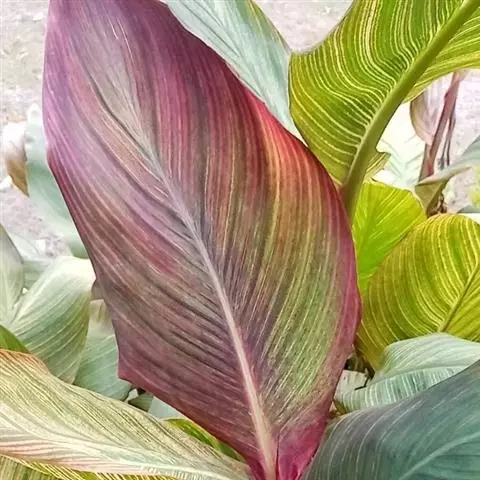 金脉美人蕉叶片淡黄色,叶脉绿化,叶缘具红边,全缘,大花美人蕉之变种