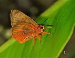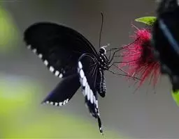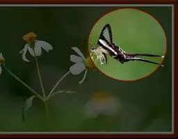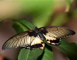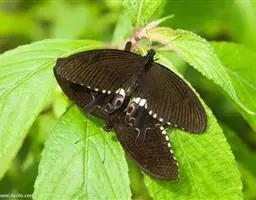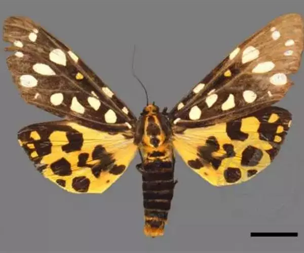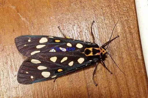 翅展66-100mm。头、胸、腹橙色,头顶中央有1个小黑斑,额、下唇须及触角黑色,颈板橙色,中间有1个闪光大黑斑,翅基片闪光黑色,胸部有闪光黑色纵斑,腹部背面具黑色横带,第1节的黑斑成三角形,末2节的成方形,侧面及腹面各具1列黑斑;前翅闪光黑色,前缘区从基部至外线处有4个黄白斑。1脉上方有6个大小不等的黄白斑,中室末有1个橙色斑点,中室外至2脉末端上方有3个斜置的黄白色大斑;后翅橙色,中室中部下方至后缘有1条黑带,横脉纹为大黑斑,其下方有2个黑斑位于2脉及1脉上,外缘翅顶至2脉处黑色,其内缘成齿状,在亚中褶外缘处有1个黑斑。