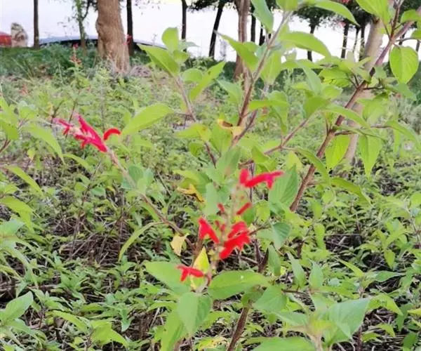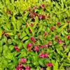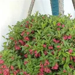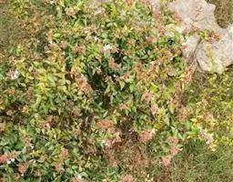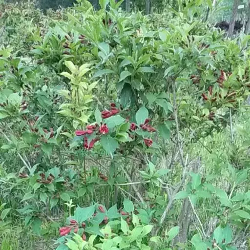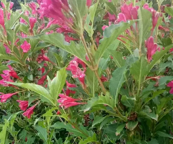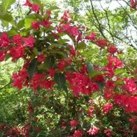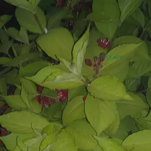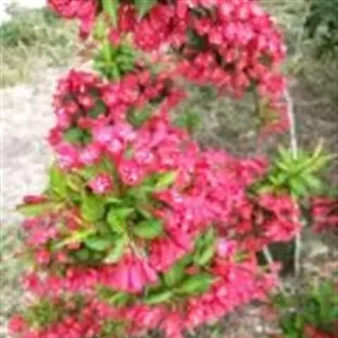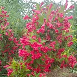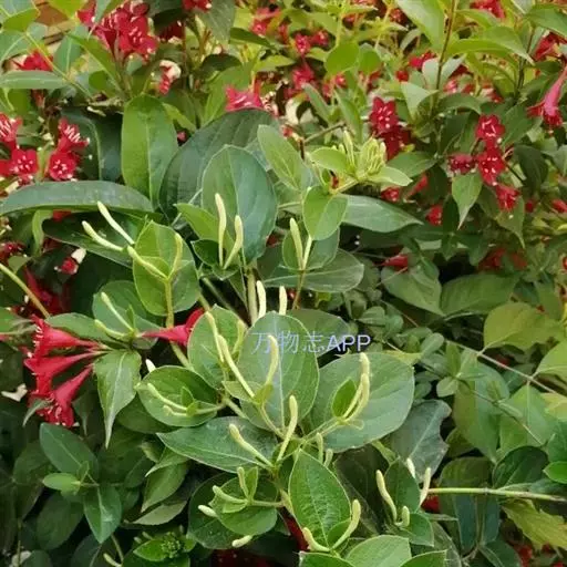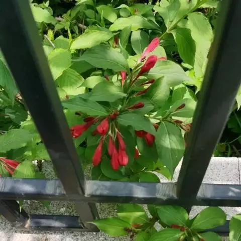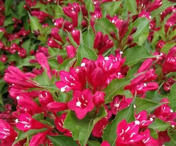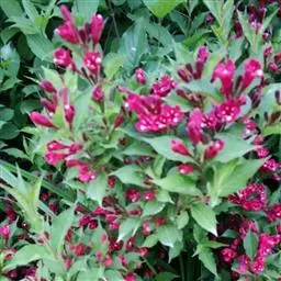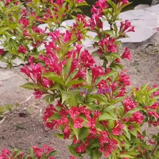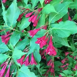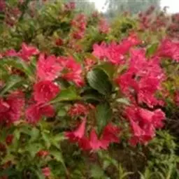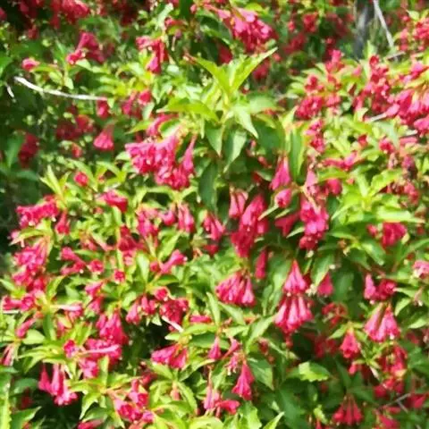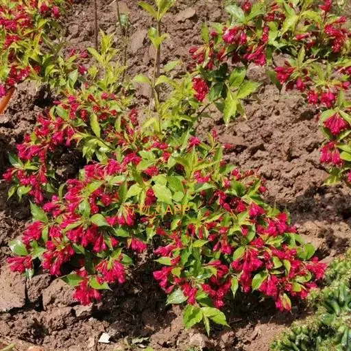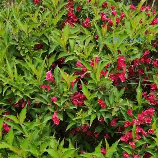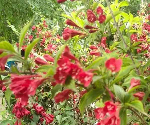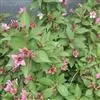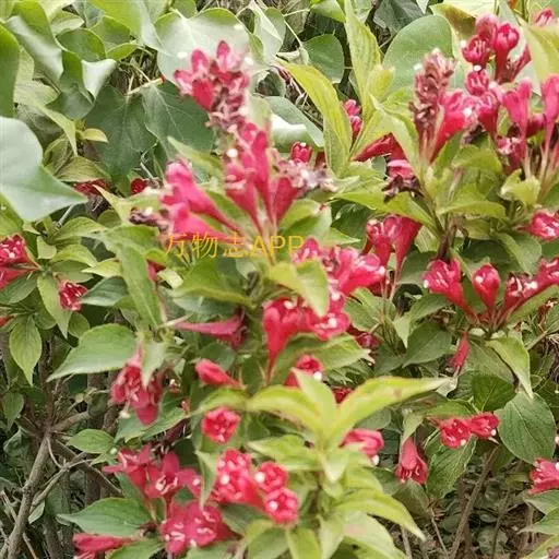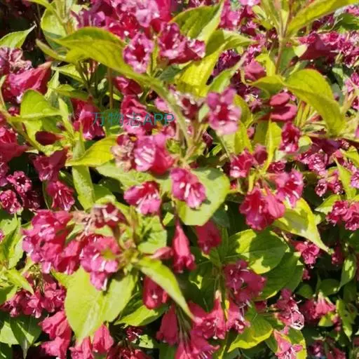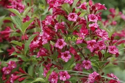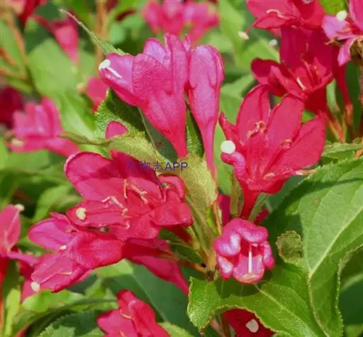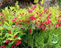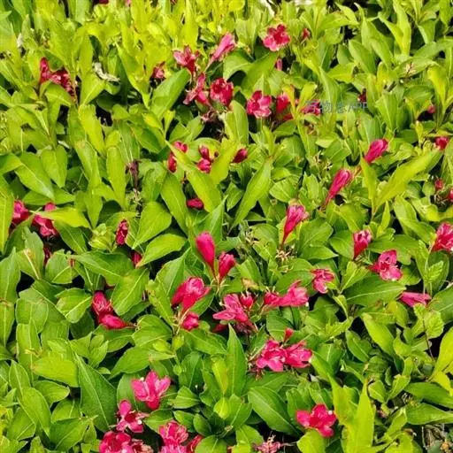 8.红王子锦带花:其植株较矮,株高1米至2米,冠幅1.4 m。嫩枝淡红色,老枝灰褐色。叶长椭圆形,整个生长季叶片为金黄色。夏初开花,花期自4月陆续开到10月 份,枝条开展成拱形。聚伞花序生于叶腋或枝顶,花冠漏斗状钟形,花朵密集,花冠胭脂红色,艳丽悦目。