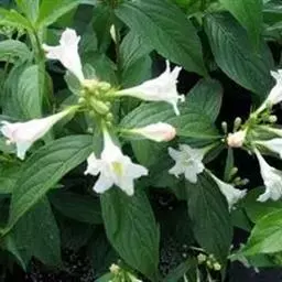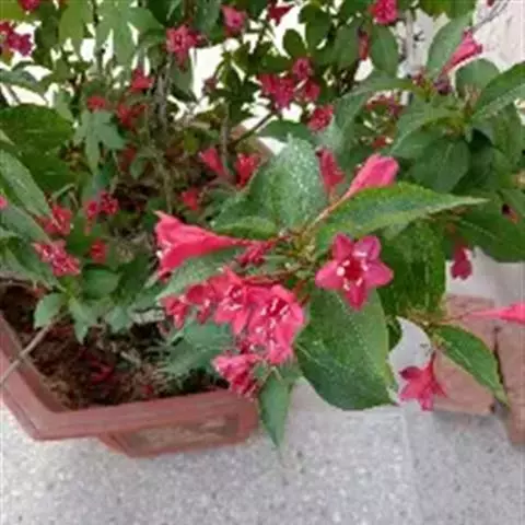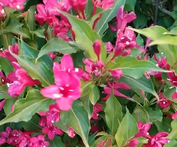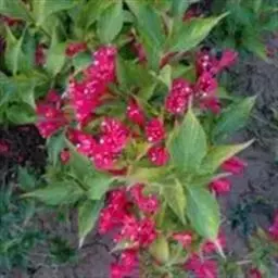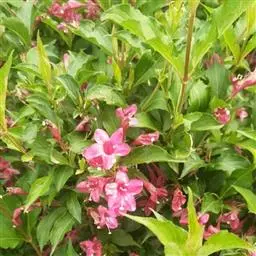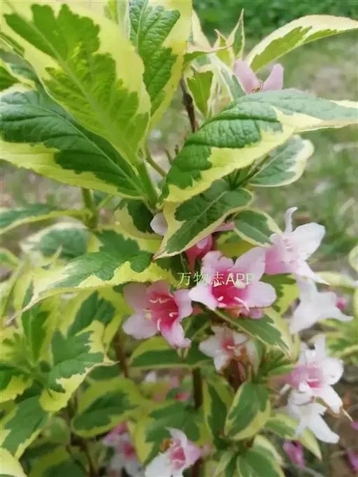 4.花叶锦带花:株高2米至3米。株丛紧密,株高1.5-2m,冠同2-2.5m,叶缘乳黄色或白色,叶对生,长卵形,叶端渐尖。聚伞花序生于枝顶,萼筒绿色,花冠喇叭状,花色由白逐渐变为粉红色,由于花开放时间不同,有白、有红,使整个植株呈现 两色花,在花叶衬托下,格外绚丽多彩。