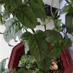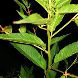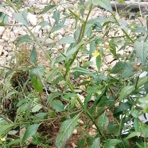 半灌木,茎直立,高50-200厘米,粗6-20毫米,多分枝,被短柔毛与腺毛,老时渐变无毛,幼枝带红色。叶对生,卵形或狭卵形,长3-9厘米,宽2.5-5厘米,中部的较大,先端渐尖,基部浅心形或钝圆,边缘具远离的浅齿或齿突,脉常带红色,侧脉6-11对,在近边缘环结,两面尤下面脉上被短柔毛;叶柄长2-3.5厘米,常带红色,被短柔毛与腺毛;托叶狭卵形至钻形,长约1.5毫米,早落。