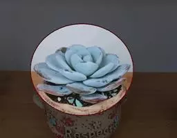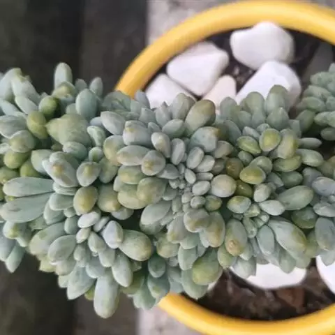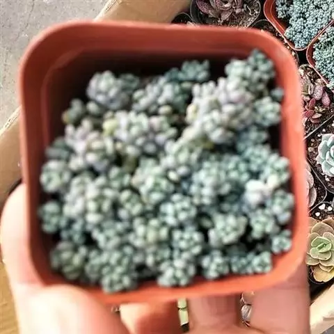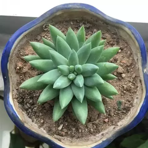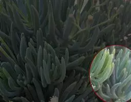 蓝黛莲是一种景天科厚叶草属植物。叶片呈略扁的圆柱形,排列成莲座状;颜色为灰绿色,…