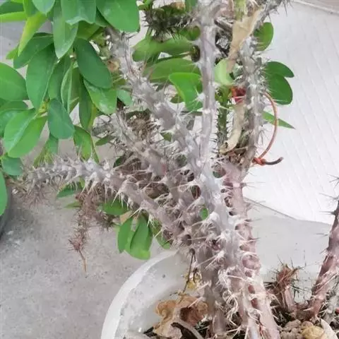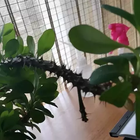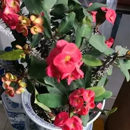 虎刺梅:别称铁海棠,是蔓生灌木植物。茎多分枝,长60-100厘米,直径5-10毫米,具纵棱,密生硬…