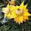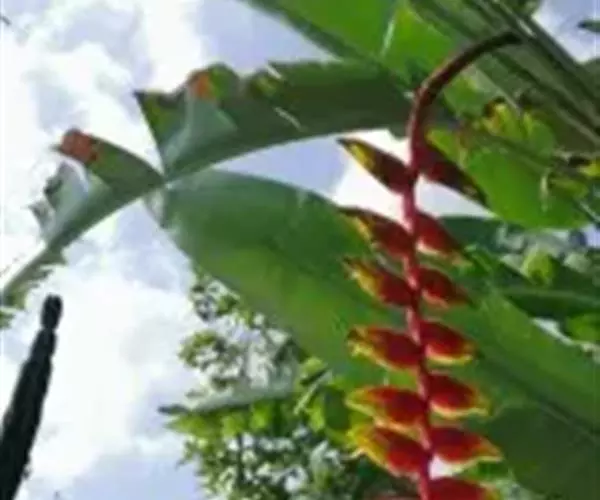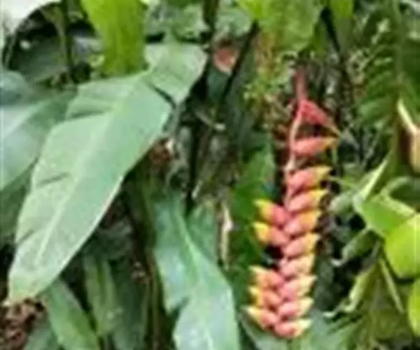 金嘴蝎尾蕉(Heliconia rostrata Ruiz & Pavon):芭蕉科,蝎尾蕉属多年生草本植物。株高可达6米。叶片长圆形,叶面绿色,叶背亮紫色;顶生花序,直立,薄被短柔毛;苞片绿色,开放时突露,花被片红色,顶端绿色,狭圆柱形,果三棱形,灰蓝色,有种子不多于3颗。5-10月开花。