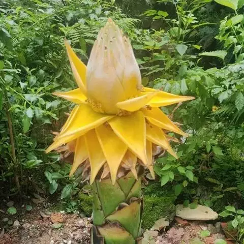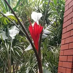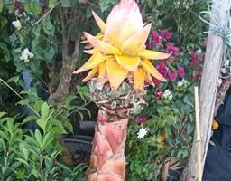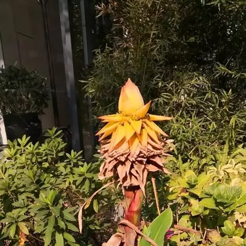花序蝎尾状,长30-50厘米,木质的苞片互生,呈二列互生排列成串,船形,基部深红色,近顶端1/3为金黄色,边缘有黄绿色相间斑纹,形如金色