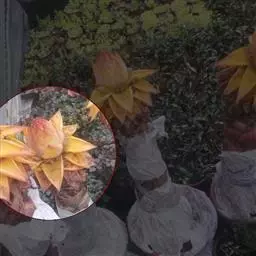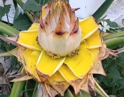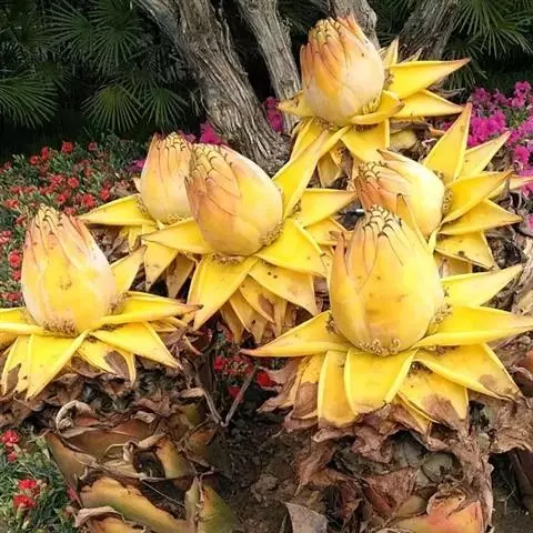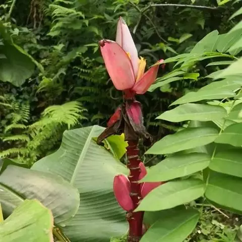 紫苞芭蕉形如一枝亭亭玉立、含苞待放的荷花,但却开在高高的芭蕉树上,这就是紫苞芭蕉。