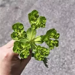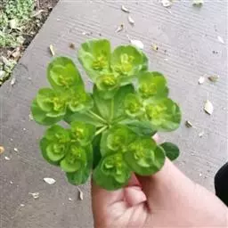 总苞陀螺状,高约2毫米,直径约1.5毫米,内侧被短柔毛;腺体5枚,盾状卵形或近圆形。雄花数枚,伸出总苞之外;雌花1枚,子房柄伸出总苞边缘;子房光滑无毛;花柱3,中部以下合生;柱头2裂。蒴果棱状三角形,长度与直径均约8毫米,平滑,略被毛或无毛。种子卵球状,长与直径均约4毫米,平滑;具微小的种阜。花果期7~10月。白色乳汁有剧毒,需特别谨慎以免中毒。