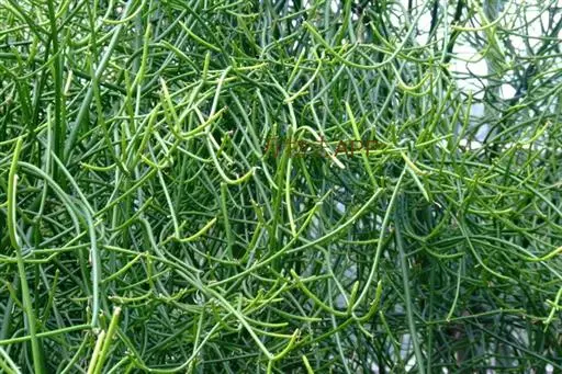 灌木或小乔木,萃直立,高可达2~5m,全株有白色乳汁(白色液体有毒);小枝对生或近轮生,绿色,稍肉质。叶退化成鳞片状,或少数散生枝端。杯状聚伞花序,顶生或腋生,总苞片陀螺状一直径约2mm,有5个腺体,雄花少数,雌花淡黄色,花柱下部合生,柱头头状,先端短2裂。子房3室。蒴果暗黑色,被贴伏的柔毛;种子卵形。