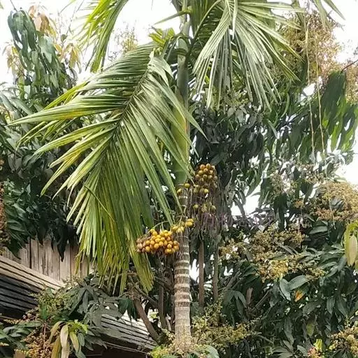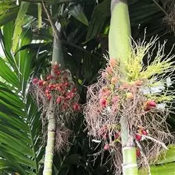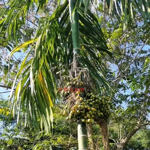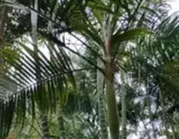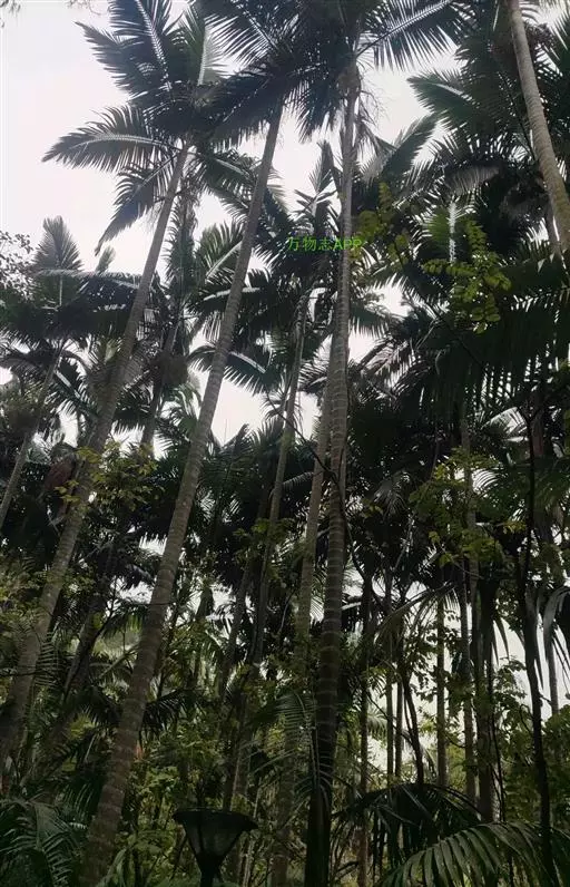 槟榔(学名:Areca catechu L.),是单子叶植物纲、初生目、棕榈科、槟榔属常绿乔木,茎直立,乔木状,高10多米,最高可达30米,有明显的环状叶痕,雌雄同株,花序多分枝,子房长圆形,果实长圆形或卵球形,种子卵形,花果期3-4月。