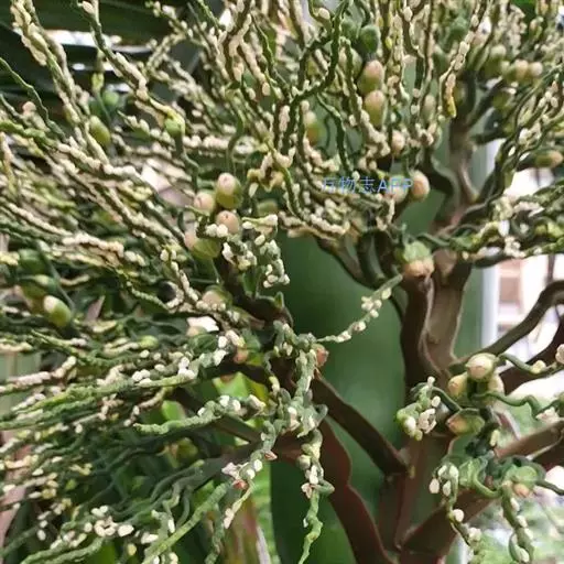 雌雄同株,花序多分枝,花序轴粗壮压扁,分枝曲折,长25-30厘米,上部纤细,着生1列或,2列的雄花,而雌花单生于分枝的基部;雄花小,无梗,通常单生,很少成对着生,萼片卵形,长不到1毫米,花瓣长圆形,长4-6毫米,雄蕊6枚,花丝短,退化雌蕊3枚,线形;雌花较大,萼片卵形,花瓣近圆形,长1.2-1.5厘米,退化雄蕊6枚,合生;子房长圆形。
