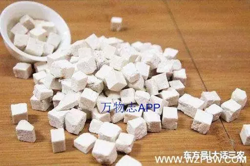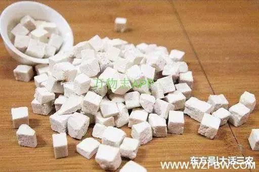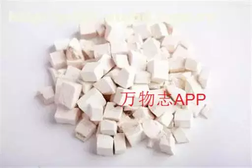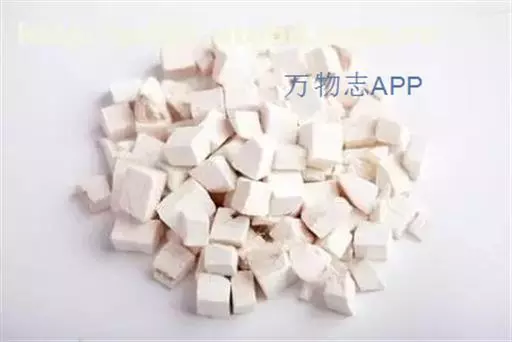 2、茯苓块:为去皮后切制的茯苓,呈立方块状或方块状厚片,大小不一。白色、淡红色或淡棕色。