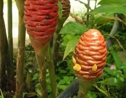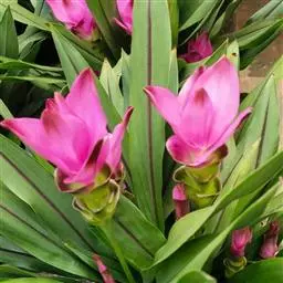 姜荷花因其花序亭亭玉立,粉红色苞片外形似荷花而被命名,同时又因其原产热带,花朵外形似郁金香而被称为“热带郁金香”。多年生球根草本花卉。株高30~80厘米,花径通常高于叶片。地下有纺锤形或圆球形根茎,球茎上有两排对生的芽,芽的生长有偏向一侧的习性,可连续产生多个,但春季种植后,通常先萌发第一个第一代芽,此芽常有5~7片叶,以后生长的芽只有3~4片叶。