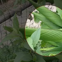 姜荷花的叶片为长椭圆形,中肋紫红色,在露天栽培下,平均叶片长度约为30厘米,宽度约5厘米,一般比花茎短。但在遮荫栽培下,叶片较为狭长,长度可达45厘米,有时甚至比花茎还长。