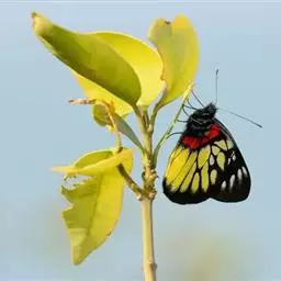 纹黄蝶,翅面黄色,缘毛桃红色;前翅外缘宽的黑边中有几个黄色斑,中室端部有一个黑斑;后翅外缘的黑色斑…