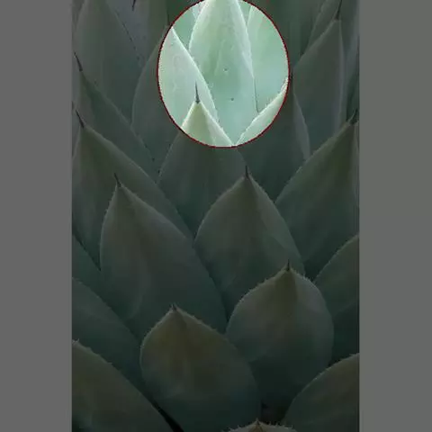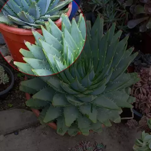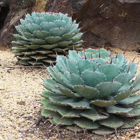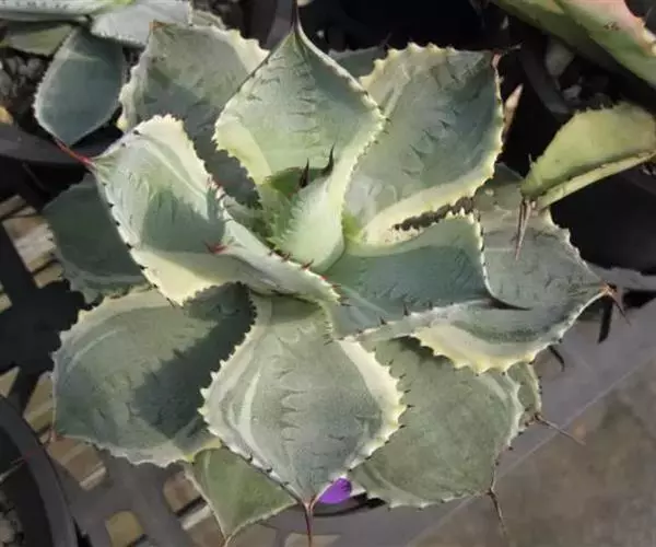 雷神为多年生肉质植物。植株高度20厘米,呈莲座状簇生。叶片长25厘米,青绿色披白粉。叶片根部狭窄肥厚,先端尖锐,且长有锈红色尖刺。叶片边缘分布多对波浪状短刺,整体呈倒卯状。夏季开花,黄绿色,呈漏斗状 。
