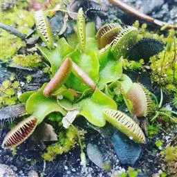 (学名:Dracula),爱尔兰人Trev培育的园艺种,从G14和齿状捕杂交的后代中挑选出来的一棵实生苗。德库拉大部分时候是短小的贴地叶,只会长两三片直立叶。它的夹子背面弯曲成弧形,牙齿像齿状捕蝇草。光照充足而上色的时候,夹子内侧深红色,而外侧会有一条血红的线。