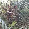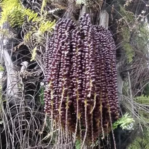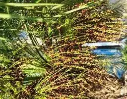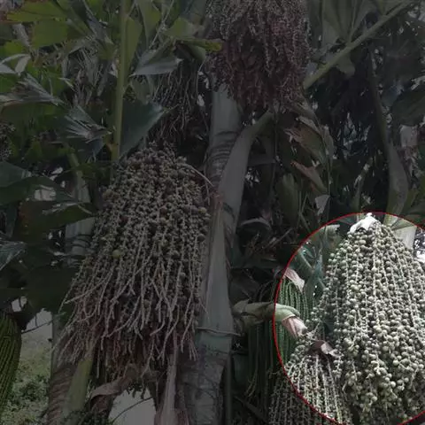 花序生于叶鞘之下,呈圆锥花序式,长约0.8米,具2-3次分枝,分枝花序长20-30厘米,其上有8-10个小穗轴,长12-18厘米;花小,卵球形,金黄色,螺旋状着生于小穗轴上;雄花萼片和花瓣各3片,上面具条纹脉,雄蕊6,花药多少丁字着;雌花萼片和花瓣与雄花的略同,子房1室,具短的花柱和粗的柱头。