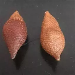 果实略为陀螺形或倒卵形,长约1.5-1.8厘米,直径0.8-1厘米,鲜时土黄色,干时紫黑色,外果皮光滑,中果皮具网状纤维。种子略为倒卵形,胚乳均匀,中央有狭长的空腔,胚侧生。花期5月,果期8月。