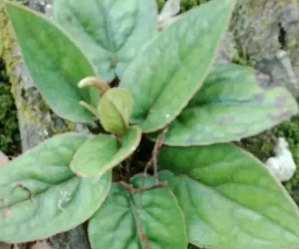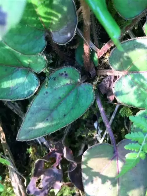 多年生草本。根状茎短或伸长,有时可离地面近2厘米,圆柱形,直或弯曲,直径1-3毫米,根颈被褐色绒毛,具簇生细长须根。茎直立,单一,不分枝,花葶状,高25-60厘米,被褐色长柔毛。叶聚生于茎的基部,莲座状或呈假轮生,叶片厚纸质,卵形、狭卵形或卵状长圆形,长2-11厘米,宽1.5-5厘米,顶端钝或中脉延伸具一小的凸尖头,基部深心形,边全缘或具疏离的胼胝体状小齿,有向上弯拱的缘毛,上面绿色,无毛或被疏毛,下面淡绿色或有时多少带紫红色,被较密的长柔毛,脉上尤甚;基出脉5条,在下面明显增粗并凸起,中脉中上部复具1-2对侧脉,网脉略明显,网眼大;叶柄长1.5-6厘米,稀更长,无翅,密被长柔毛。