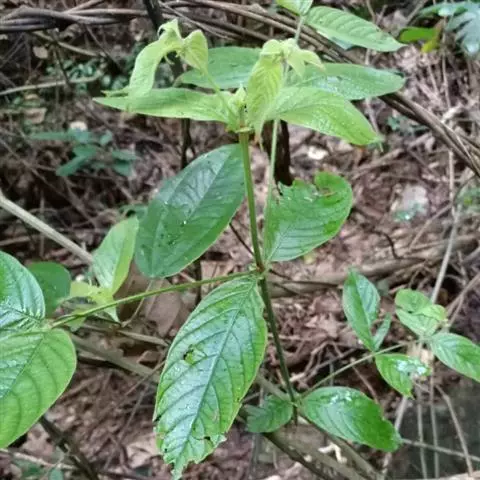 多年生匍匐小草本,近无毛。叶生于茎上部的密集,生于下部的疏离,卵形或卵状三角形,长约6毫米,宽4-8毫米,顶端短尖,基部钝或浅心形,边全缘;叶脉在叶片两面明显;叶柄纤细,长2-4毫米;托叶卵状三角形,宽1-1.5毫米,顶端里面有白色柔毛。花无梗,顶生,单朵,细小。核果球形,直径3-5毫米,成熟时红色,内有小核2颗。