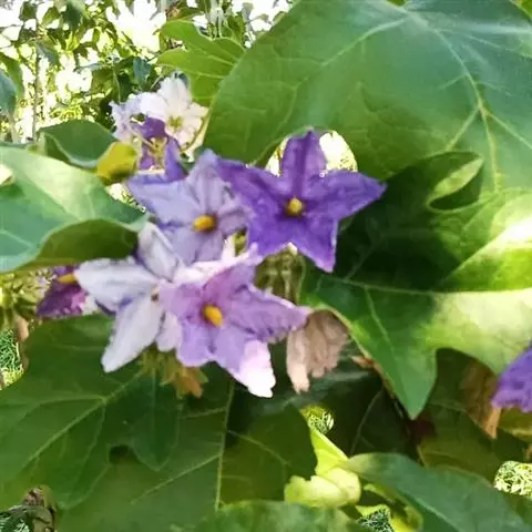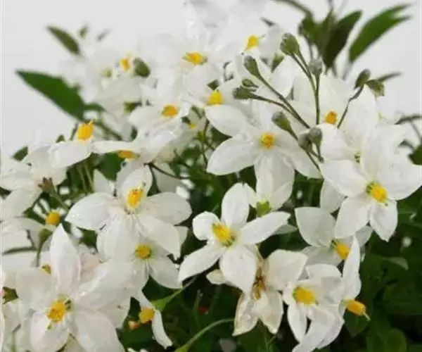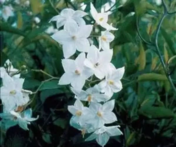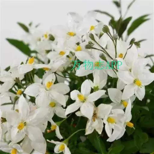 素馨叶白英(学名Solanum jasmioides Paxt.),是双子叶植物纲、茄科、茄属的一种缠绕灌木,多分枝,光滑无毛,茎具纵向细条纹。聚伞式圆锥花序顶生或侧生;花白带蓝色;萼星形,萼齿长圆形;花冠辐形,具皱折;雄蕊着生于花冠筒喉部,花药黄色,子房长圆形。原产于巴西,中国浙江农学院曾引种栽培。它可用作藤蔓花卉。