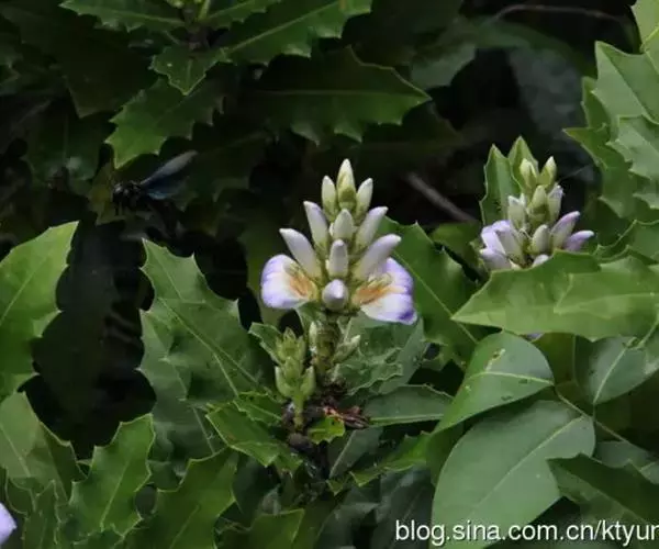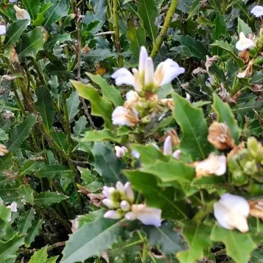 穗状花序顶生;苞片对生,宽卵形,长7-8毫米,无刺,早落;小苞片卵形,长约5毫米,革质;花萼裂片4,外方的1对宽卵形,长10-13毫米,顶端微缺,边缘质薄,有时成皱波状,具缘毛,内方的1对卵形,长约10毫米,全缘。花冠白色,长3-4厘米,花冠管长约6毫米,上唇退化,下唇倒卵形,长约3厘米,薄革质,顶端3裂,外面被柔毛,内面上部两侧各有1条3-4毫米宽的被毛带;雄蕊4,近等长,花药1室,纵裂,裂缝两侧各有1列髯毛,花丝粗厚,长1.5厘米,最宽处约2毫米,近软骨质;子房顶部软骨质,花柱有纵纹,长2.2厘米;柱头2裂。蒴果椭圆形,长2.5-3厘米,有种子4颗。种子扁平,圆肾形,淡黄色。
