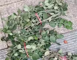 插穗采集:9月中旬间,挑选健康成熟,生长年龄大概在4-10年生的老鼠簕作为母树,在阴天或者晴天的早上和傍晚上,采集生长情况良好、叶片无病虫害、弯曲少、生长年龄1年至2年生的、刚木质化的枝条,采集的枝条约20厘米长,将枝条剪成10厘米长,上方平剪,剪掉侧枝,顶部留1-2片叶,并裁剪掉叶片的三分之二,留下三分之一;下方剪的部位选择在腋芽上方1-2厘米的地方,剪成与水平轴成45°的斜面;以得到插穗,用自来水洗净。