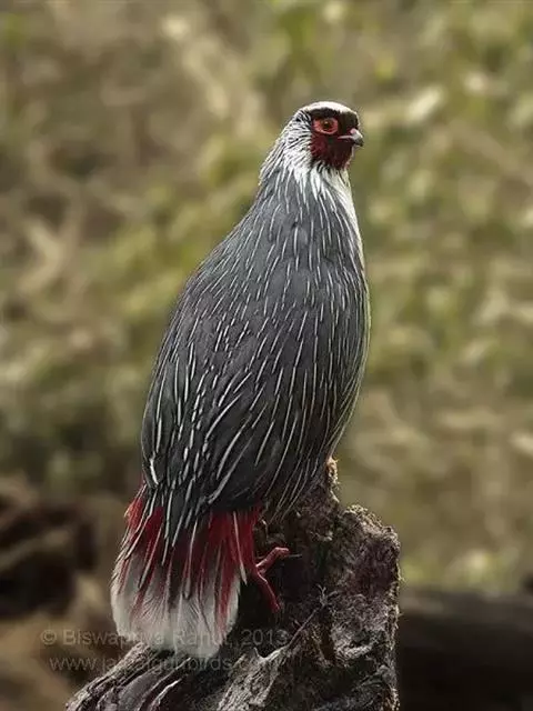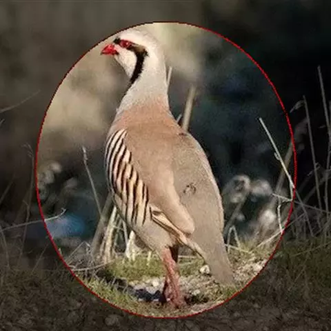 体大的灰褐色鹑类。胸灰色具黑色细纹。与相似种类四川雉鹑不同处在于栗色喉块外缘近白。有猩红色眼周裸皮。…