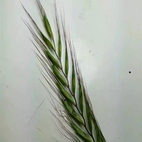 8植株绿色不被白粉;小穗绿色或带有紫色,但颖及外稃不具紫红色小点;外稃的芒粗糙无毛,绿色。(9)