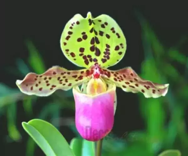 花葶直立,长16-22厘米,绿色,密生褐色或紫褐色毛,顶端生1花;花苞片近椭圆形,绿色,围抱子房,长2-2.6厘米,宽6-12毫米,先端钝,背面被栗色微柔毛,尤以近基部及中脉上为多;花梗和子房长3-4厘米,密被紫褐色短柔毛;花直径约6厘米;中萼片奶油黄色或近绿色,有许多不规则的紫褐色粗斑点,合萼片色泽相近但无斑点或具少数斑点,花瓣玫瑰红色,基部有紫褐色粗斑点,唇瓣亦玫瑰红色并略有黄白色晕与边缘;中萼片近圆形或扁圆形,长3-3.4厘米,宽3-3.8厘米,先端钝或略具短尖,上半部边缘略波状,背面被微柔毛;合萼片较狭窄,长2.7-3.5厘米,宽1.4-1.6厘米,背面亦被微柔毛;花瓣狭倒卵状椭圆形至近长圆形,长3.2-3.6厘米,宽1.4-1.6厘米,边缘多少波状,先端有不甚明显的3小齿,内表面基部偶见疏柔毛,边缘有缘毛;唇瓣倒盔状,基部具宽阔的、长约1.5厘米的柄;囊近宽椭圆形,长2.3-2.5厘米,宽约2.5厘米,囊口极宽阔,两侧各具1个直立的耳,两耳前方边缘不内折,囊底有毛;退化雄蕊倒心形至宽倒卵形,长6-7毫米,宽7-8毫米,基部有耳,上面中央具1枚齿状突起。 花期7-8月。