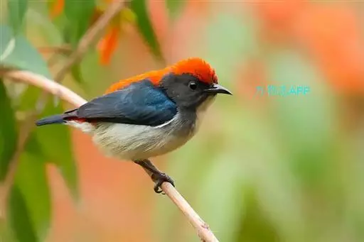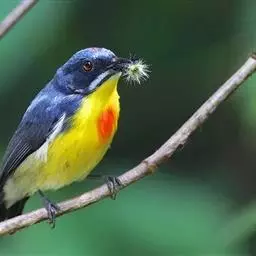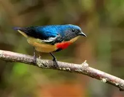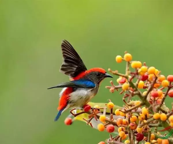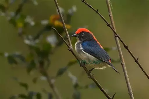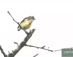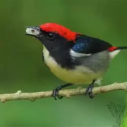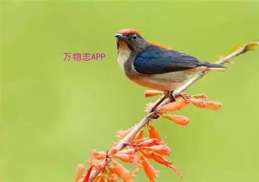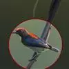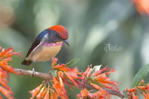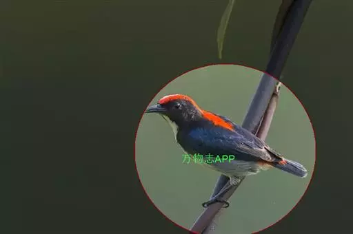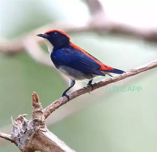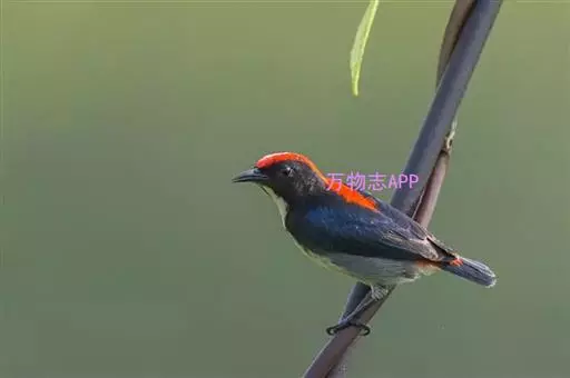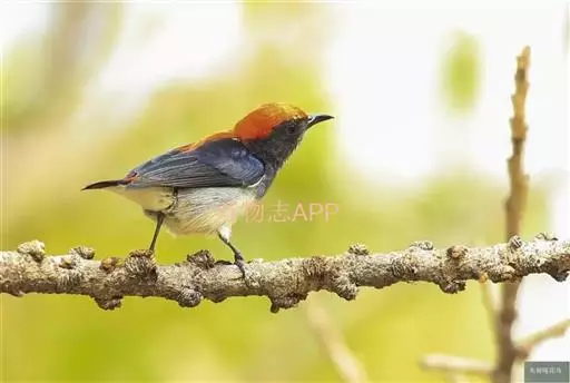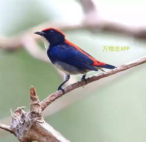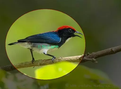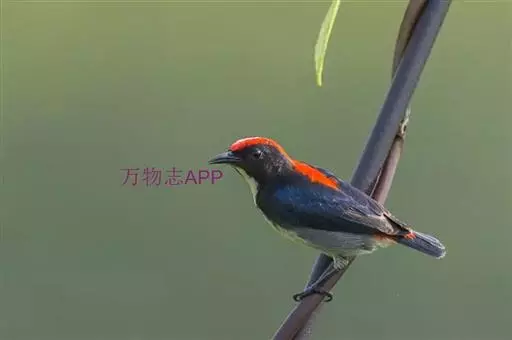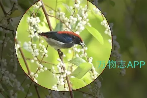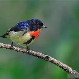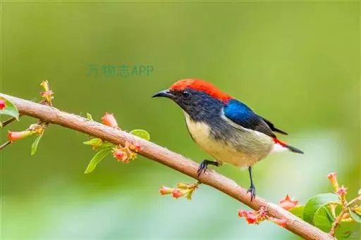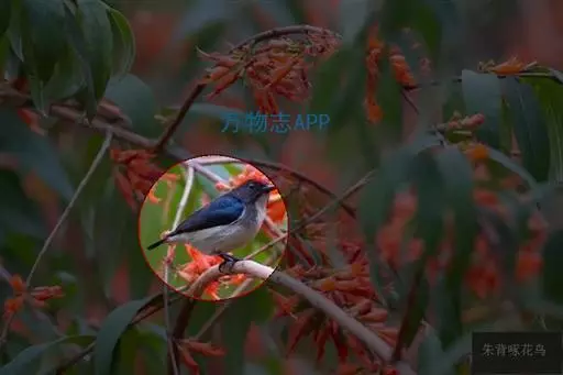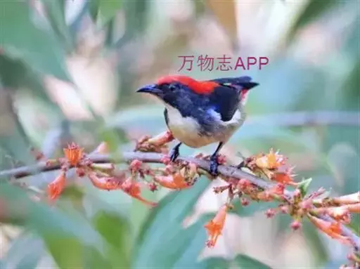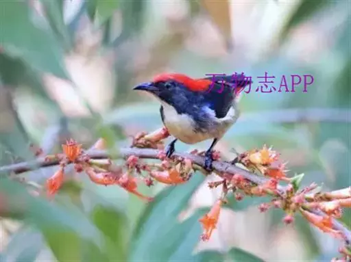 朱背啄花鸟(学名:Dicaeum cruentatum):体重6-8克,体长81-97毫米。是一种小型的黑色及红色啄花鸟。雄鸟顶冠、背及腰猩红色,两翼、头侧及尾黑,两胁灰,下体余部白色。雌鸟上体橄榄色,腰及尾上覆羽猩红,尾黑。亚成鸟清灰色,嘴橘黄,腰略沾暗橘黄色。虹膜褐色,嘴黑绿,脚黑绿。