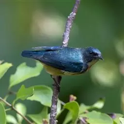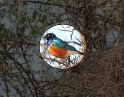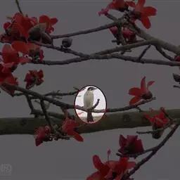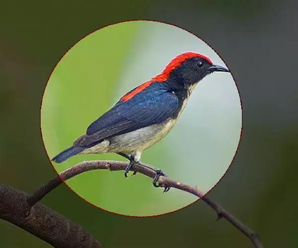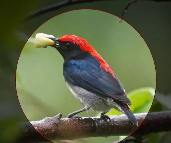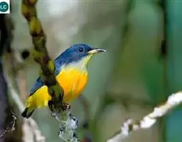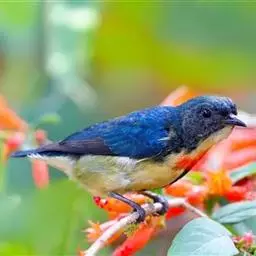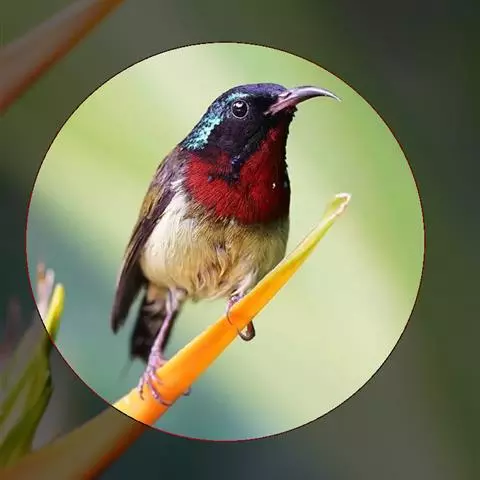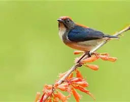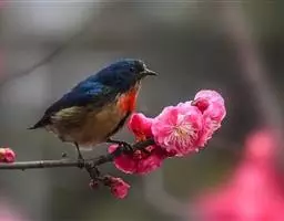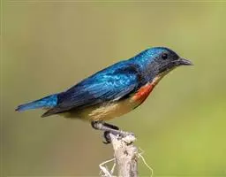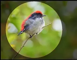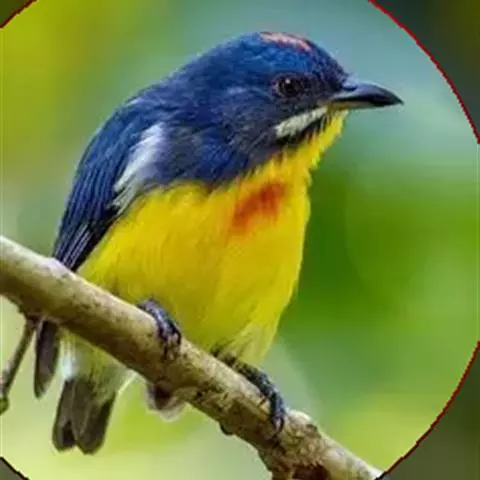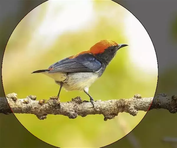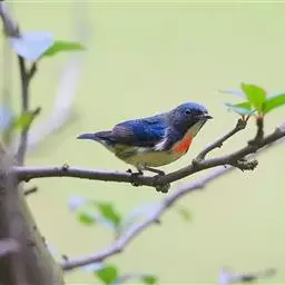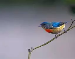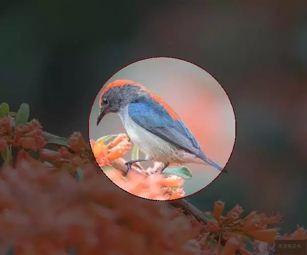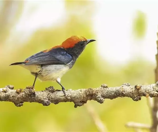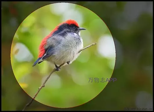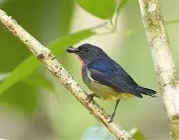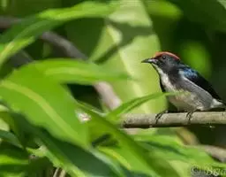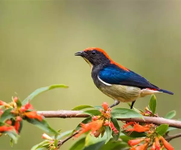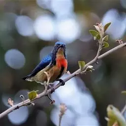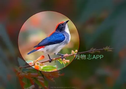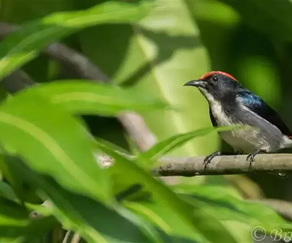 朱背啄花鸟(学名:Dicaeum cruentatum):体重6-8克,体长81-97毫米。是一种小型的黑色及红色啄花鸟。雄鸟顶冠、背及腰猩红色,两翼、头侧及尾黑,两胁灰,下体余部白色。雌鸟上体橄榄色,腰及尾上覆羽猩红,尾黑。亚成鸟清灰色,嘴橘黄,腰略沾暗橘黄色。虹膜褐色,嘴黑绿,脚黑绿。