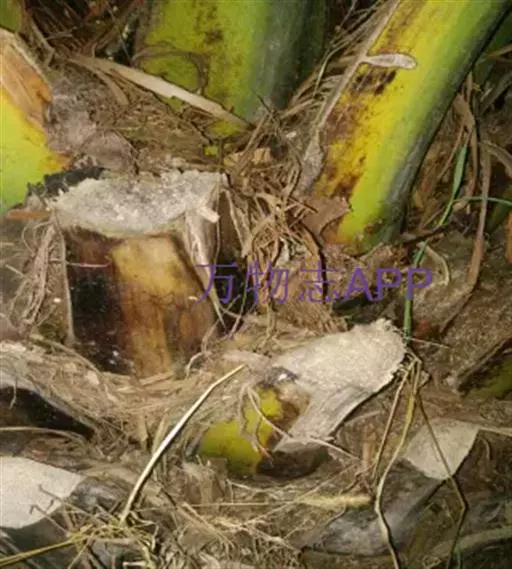 椰子泻血病是椰子产区常见的病害。病症:茎干出现裂缝,渗出暗褐色粘液,干后呈黑色,裂缝组织腐烂。防治方法有凿除病部组织,涂上10%波尔多液或煤焦油。