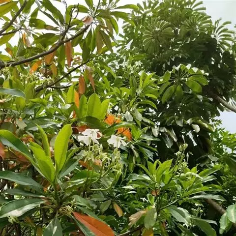 狗牙花 R. Br. ex Roem. & Schult.)是夹竹桃科山辣椒属灌木植物;枝灰绿色;叶椭圆形或椭圆状长圆形,叶面深绿色,背面淡绿色,叶面扁平;花聚伞花序腋生,通常双生,萼片长圆形,边缘有缘毛,花冠白色;果长圆形;花期六至十一月;果期秋季。狗牙花因其花冠裂片边缘有皱纹,状如狗牙,故名。狗牙花原产于印度及中国云南,在广西、广东、台湾及亚洲热带和亚热带等地区广泛栽培。狗牙花喜温暖湿润,不耐寒,宜半阴,对土壤要求不严,喜肥沃、排水良好的酸性土壤,常生长于山地灌木丛中。狗牙花的主要繁殖方式为扦插。狗牙花味酸、凉,有清热降压、解毒消肿的功效,可用于治疗咽喉肿痛,跌打损伤。狗牙花枝叶茂密,株型紧凑,花朵净白素丽,典雅朴质,盛花时十分美观,且花期长,具有一定观赏价值。狗牙花还有较高的经济价值,园林中应用极为普遍,可丛植于林缘、路
