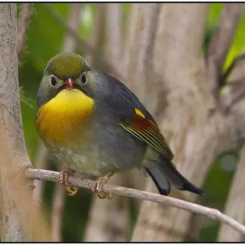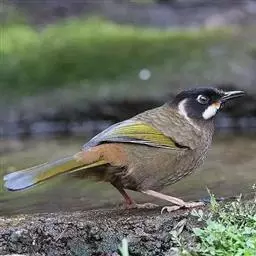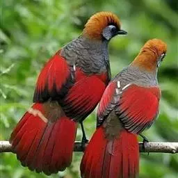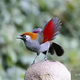 赤尾噪鹛中型鸟类,体长24~28厘米。头顶至后颈红棕色,两翅和尾鲜红色,眼先、眉纹、颊、颏和喉黑色,…
