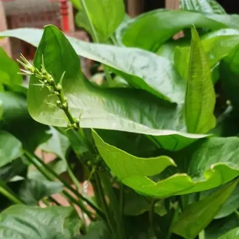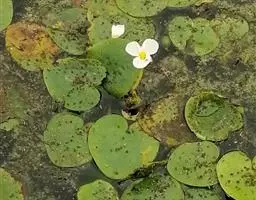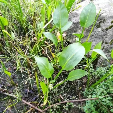 东方泽泻 块茎直径1~2厘米,或较大。叶多数;挺水叶宽披针形、椭圆形,长3.5~11.5厘米,宽1.3~6.8厘米,先端渐尖,基部近圆形或浅心形,叶脉5~7条,叶柄长3.2~34厘米,较粗壮,基部渐宽,边缘窄膜质。花葶高35~90厘米,或更高。