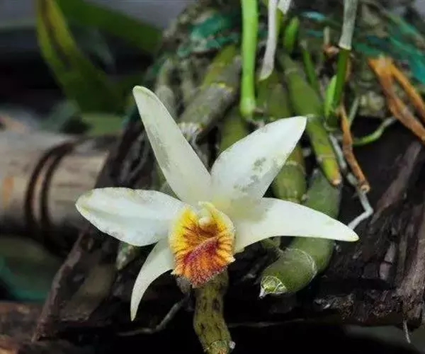 总状花序出自落了叶的老茎上端,具1-4朵花;花序柄长2-3毫米,基部被2-3枚膜质鞘;花苞片浅白色,膜质,宽卵形,长4-9毫米,先端钝;花开展,具香气,萼片和花瓣银白色或奶黄色;花梗连同子房与萼片同色,长约2厘米;中萼片长圆形,长2.7-3厘米,宽约8毫米,先端钝,具5条主脉和多数支脉;侧萼片斜卵状披针形,与中萼片等大,先端近锐尖,基部稍歪斜,具7条主脉和许多支脉;萼囊圆锥形,长约7毫米。