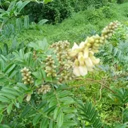 荚果长圆形或椭圆形,长3.5-6.5厘米,宽2-2.5厘米,顶端急尖或钝,果瓣革质,对种子部分有明显的网纹,有种子1(2-3)粒;种子圆肾形,扁平,长约12毫米,宽约7毫米。花期4-5月。