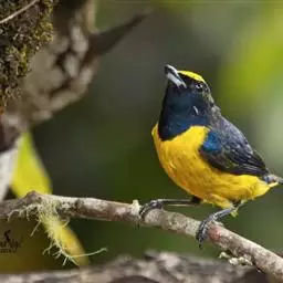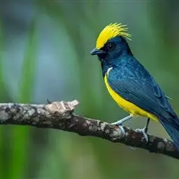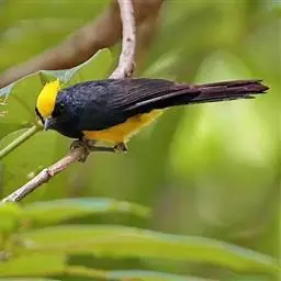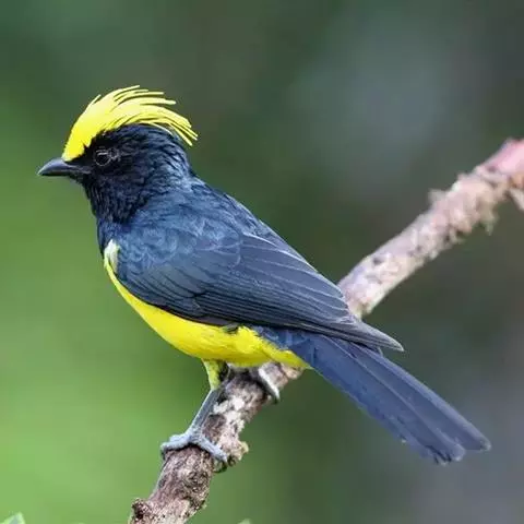 雌雄羽色相似。额基、眼先、脸、颊鲜黄色,额、头顶至后颈黑色,羽冠亦为黑色,后部冠羽末端和后颈中央白色。背、肩、腰和尾上覆羽绿色具蓝黑色金属光泽。尾暗蓝色或黑色,羽缘蓝灰色,外侧尾羽外翈白色。两翅黑色,羽缘亦为蓝灰色,内侧飞羽具白色尖端。颏、喉、颈侧、胸、腹等下体鲜黄色,两胁沾橄榄色,尾下覆羽白色。雄鸟肛周黑色,在腹部形成一块黑斑。