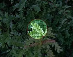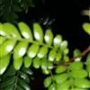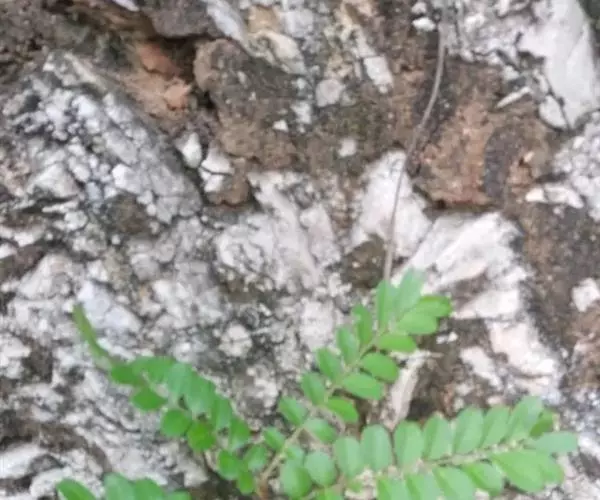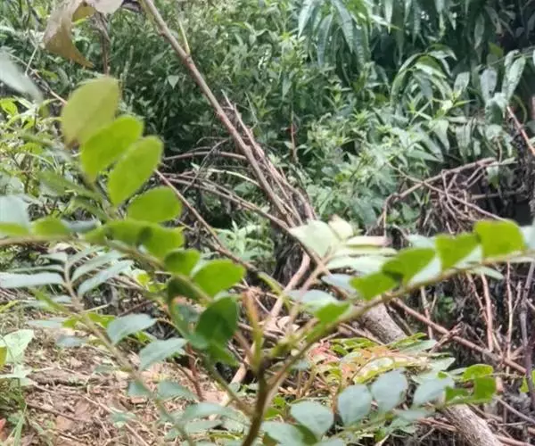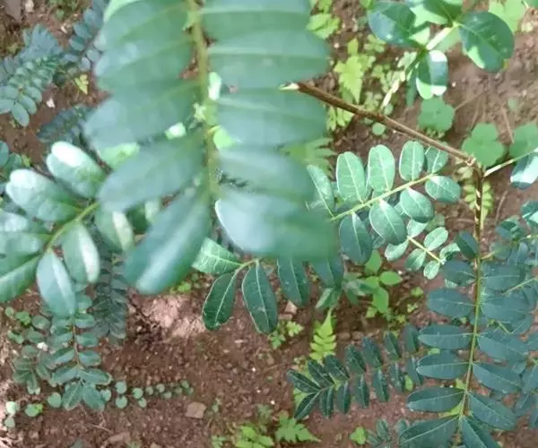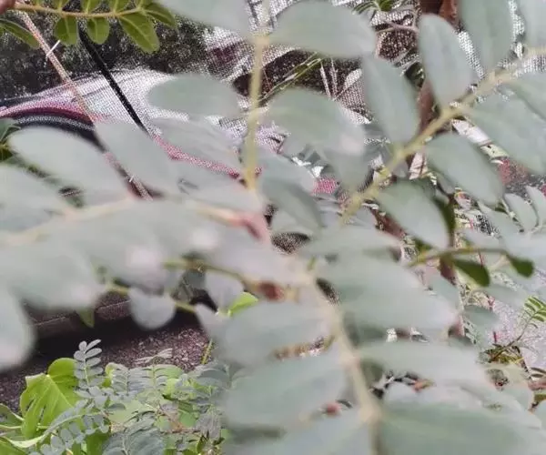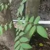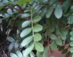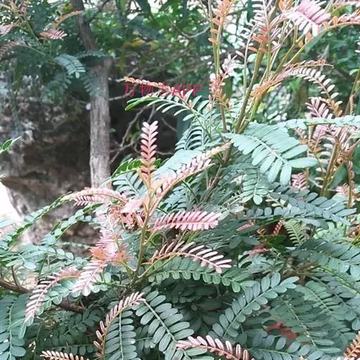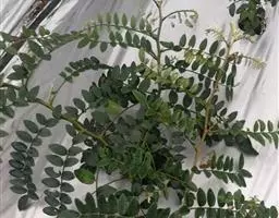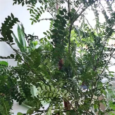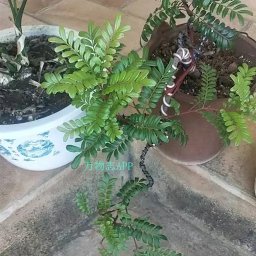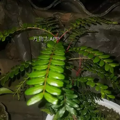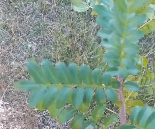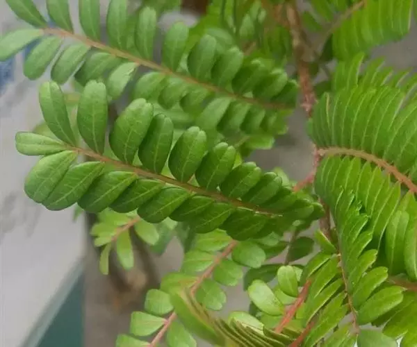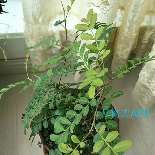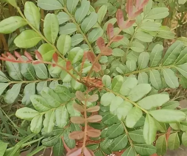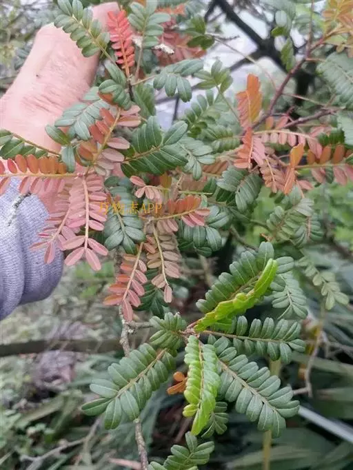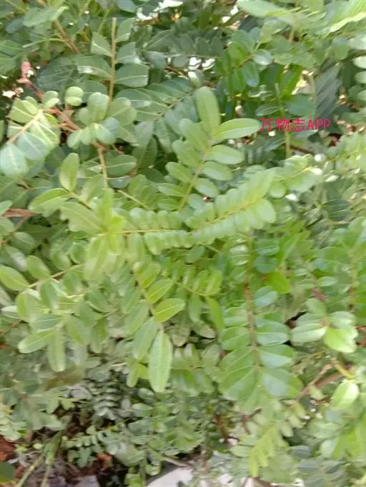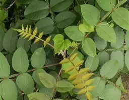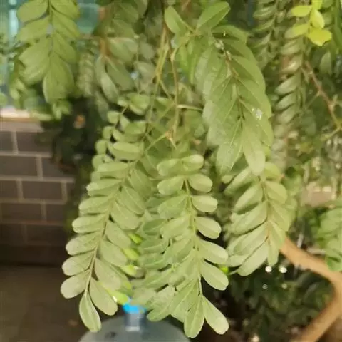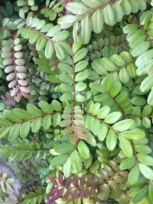 偶数羽状复叶互生,有小叶4-9对,叶轴具狭翅,上面具槽,被灰色微柔毛,叶柄被微柔毛。小叶革质,长圆形或倒卵状长圆形,较小,长1.3-3.5厘米,宽0.8-1.5厘米,稀较大(5×1.8厘米);先端微缺,具芒刺状硬尖头,基部略不对称,阔楔形;全缘,略背卷,两面中脉上被极细微柔毛,侧脉在叶面微凹,在叶背明显突起;小叶柄极短。