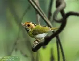 黑脸鹟莺:体长10厘米,是有特色的体小而多彩的莺鸟。粗眉纹,颏、喉及尾下覆羽黄色,脸罩黑,…