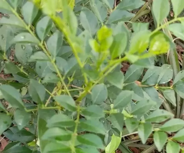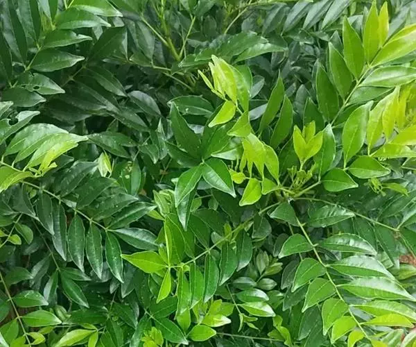 叶有小叶11-21片,稀较少;小叶通常对生或偶有不整齐对生,斜卵形,斜长方形或呈镰刀状,有时倒卵形,幼苗小叶多为阔卵形,长2.5-7厘米,宽1-3厘米,顶部短尖或钝,两侧甚不对称,全缘,或中部以上有疏裂齿,鲜叶的油点肉眼可见,也有油点不显的,叶轴腹面有狭窄、绿色的叶质边缘,常呈狭翼状。