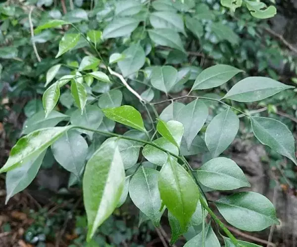 小乔木,高达12m。树干及小枝白灰或淡黄灰色,略有光泽,当年生枝绿色,其横切面呈钝三角形,底边近圆弧形。幼苗期的叶为单叶,其后为单小叶及二小叶,成长叶有小叶3~5、稀7片;小叶深绿色,叶面有光泽,卵形或卵状披针形,长3~-9cm,宽1.5~4cm,顶部狭长渐尖,稀短尖,基部短尖,两侧对称或一侧偏斜,边全缘,波浪状起伏,侧脉每边4~8条;小叶柄长不足1cm。