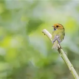 棕脸鹟莺:体长10厘米,是一种色彩亮丽而有特色的莺鸟。头栗色,具黑色侧冠纹。上体绿,腰黄色。下体白,…